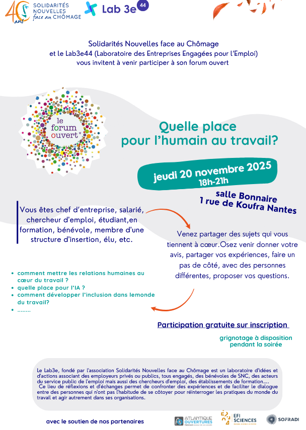 Le jeudi 20 novembre de 18h à 21h c’est le forum ouvert organisé par Solidarités Nouvelles face au Chômage (SNC) et le Lab3e (Laboratoire des Entreprises Engagées pour L’Emploi). Cette année, ce format collaboratif de partage et de réflexion est dédié à la question : quelle place pour l’humain au travail ? Quel que soit votre profil, ce que vous avez à en dire est important ! Venez partager vos expériences, découvrir celles des personnes différentes, faire un pas de côté, … 👉